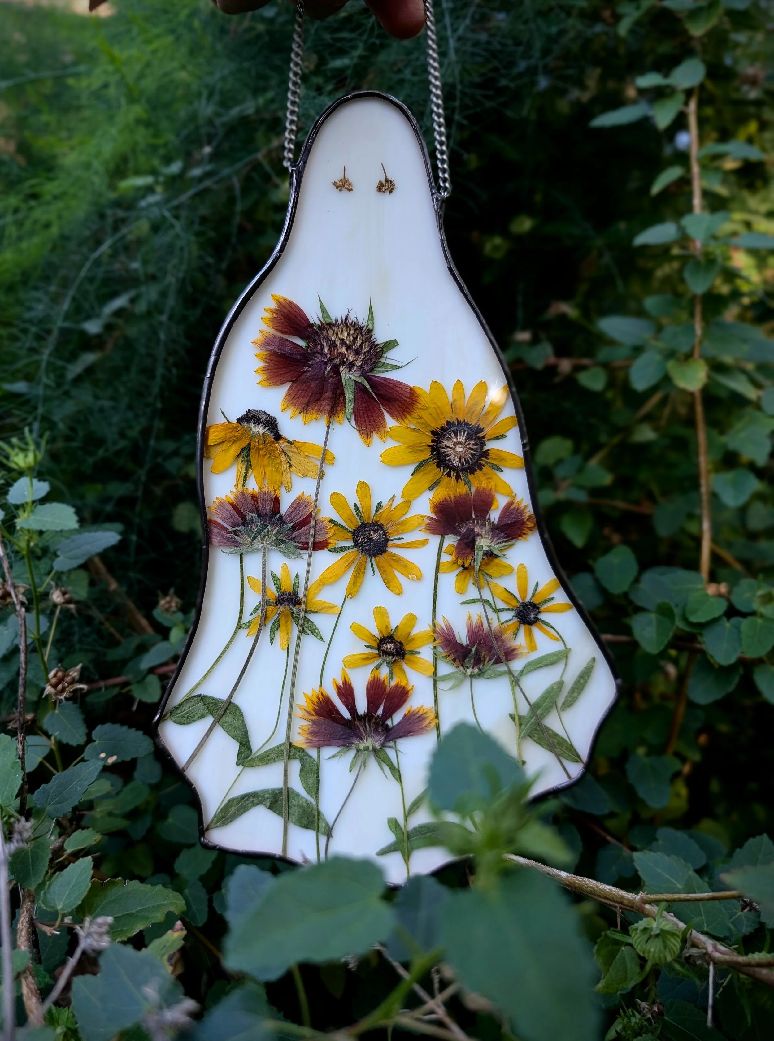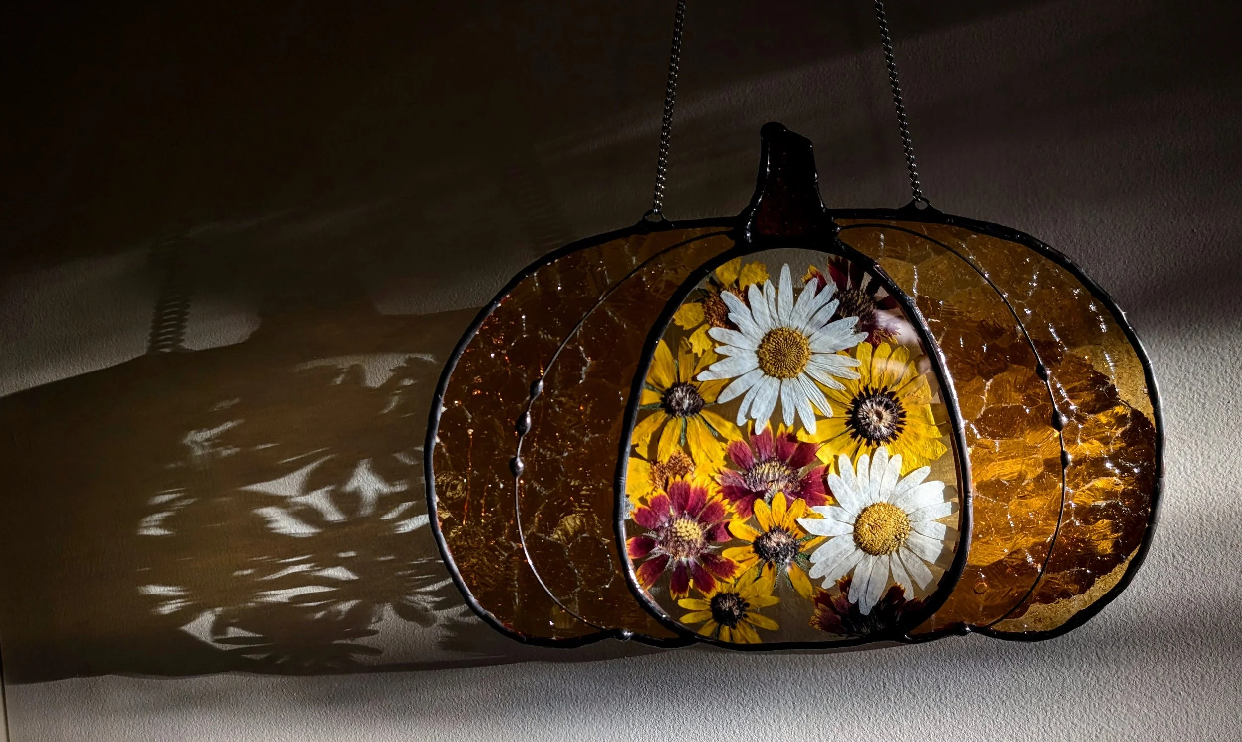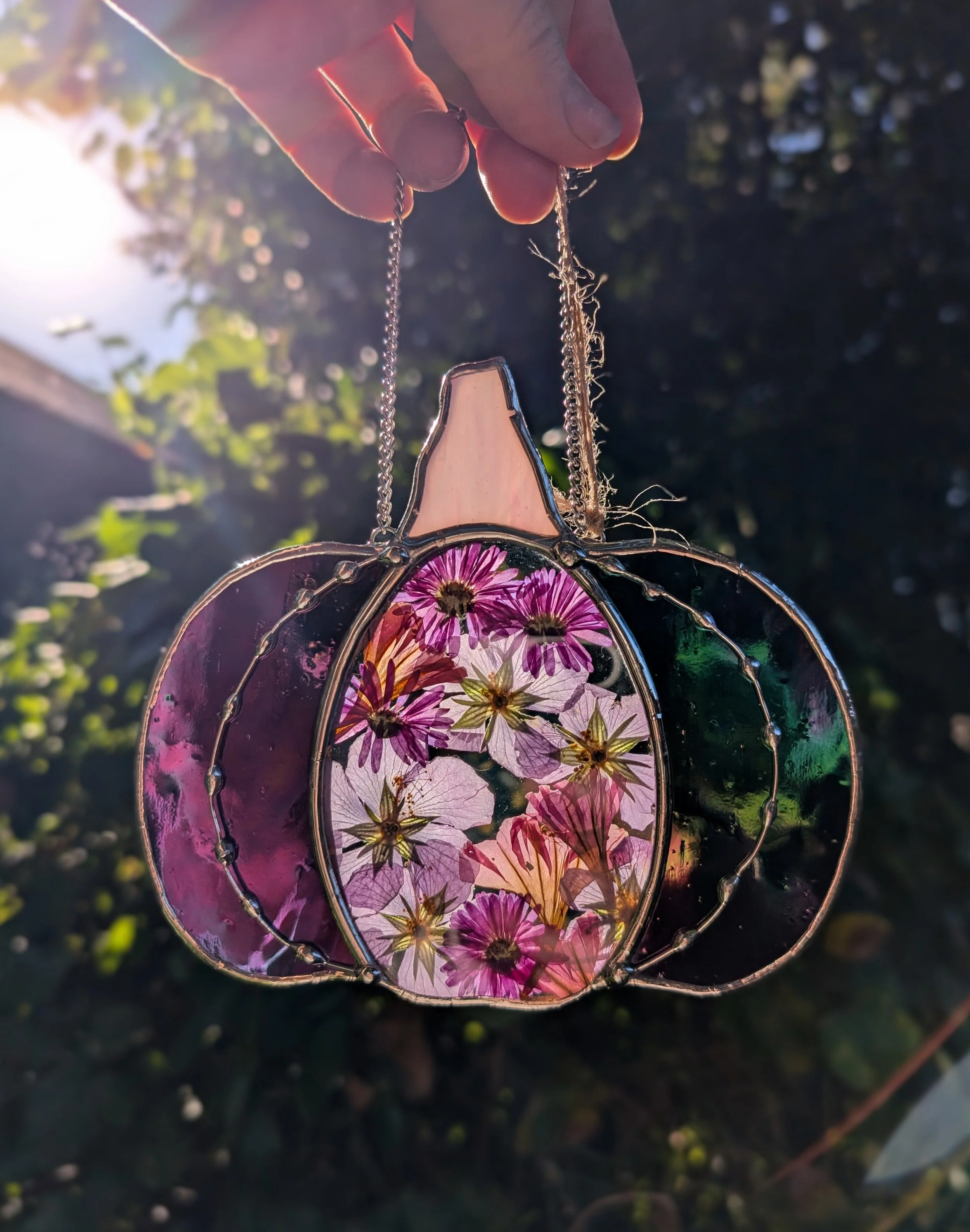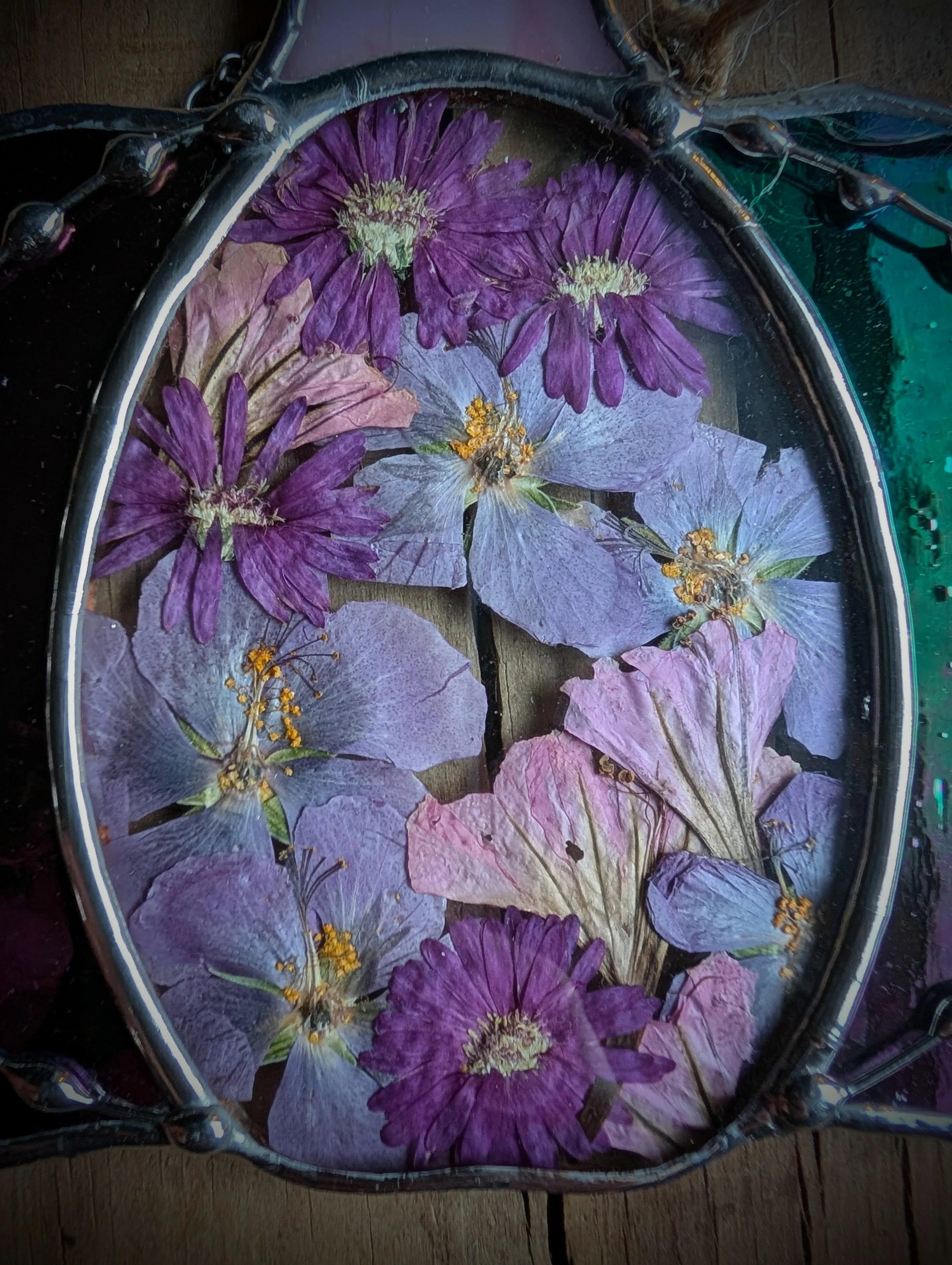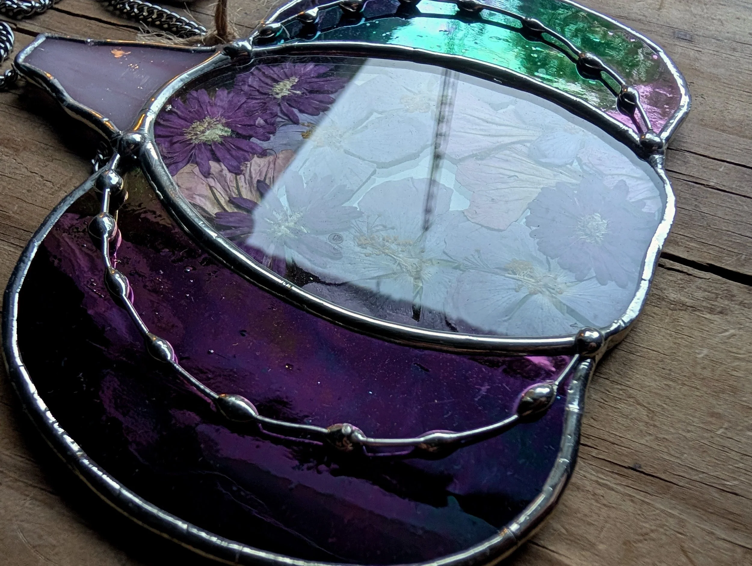 Categories: All Candle Holders Plant Stakes NightLights Holiday Decor Mirrors Jewelry Wall Decor Chimes and Danglies Floral Suncatchers Jewelry Organization All Candle Holders Plant Stakes NightLights Holiday Decor Mirrors Jewelry Wall Decor Chimes and Danglies Floral Suncatchers Jewelry Organization Stained Glass Ghost with Wildflowers $70.00 Stained Glass Floral Pumpkin - Large $80.00 Stained Glass Floral Pumpkin - Teel $50.00 Stained Glass Floral Pumpkin - Purple and Pink $50.00 Stained Glass Floral Pumpkin - Violet $50.00 Stained Glass Framed Candle Sconce/Hanging Shelf $100.00 Sold Out Pressed Flower Stained Glass Candle Holder - Rainbow Hydrangea $55.00 Stained Glass Flower Nightlights $45.00 Mirror Based Stained Glass Tray with Queen Anne's Lace $80.00 Suncatcher - "Weeds" framed in Stained Glass $95.00 Ring Dish - Mauve stained glass with Viburnum buds and Salsify seeds $55.00 Adjustable Necklace - Fiery Skipper Butterfly Wings in Double Clear Glass $60.00