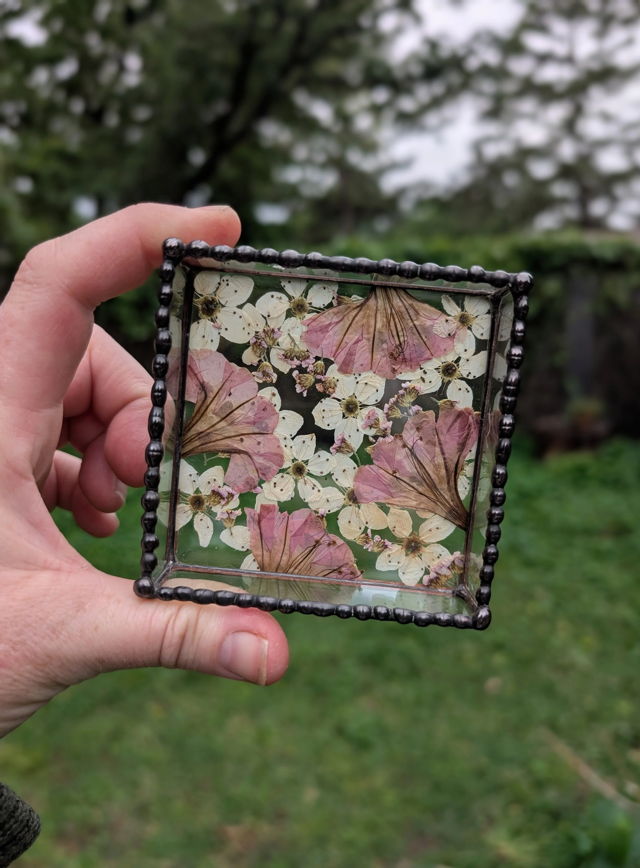 This sweet little tray is all clear glass, and the base is double glass with Bradford Pear Tree blooms, Four O’clock Flowers, and tiny little pink blooms sprinkled in. The edges are beaded on top and stained with a black patina, then polished to a shine.
