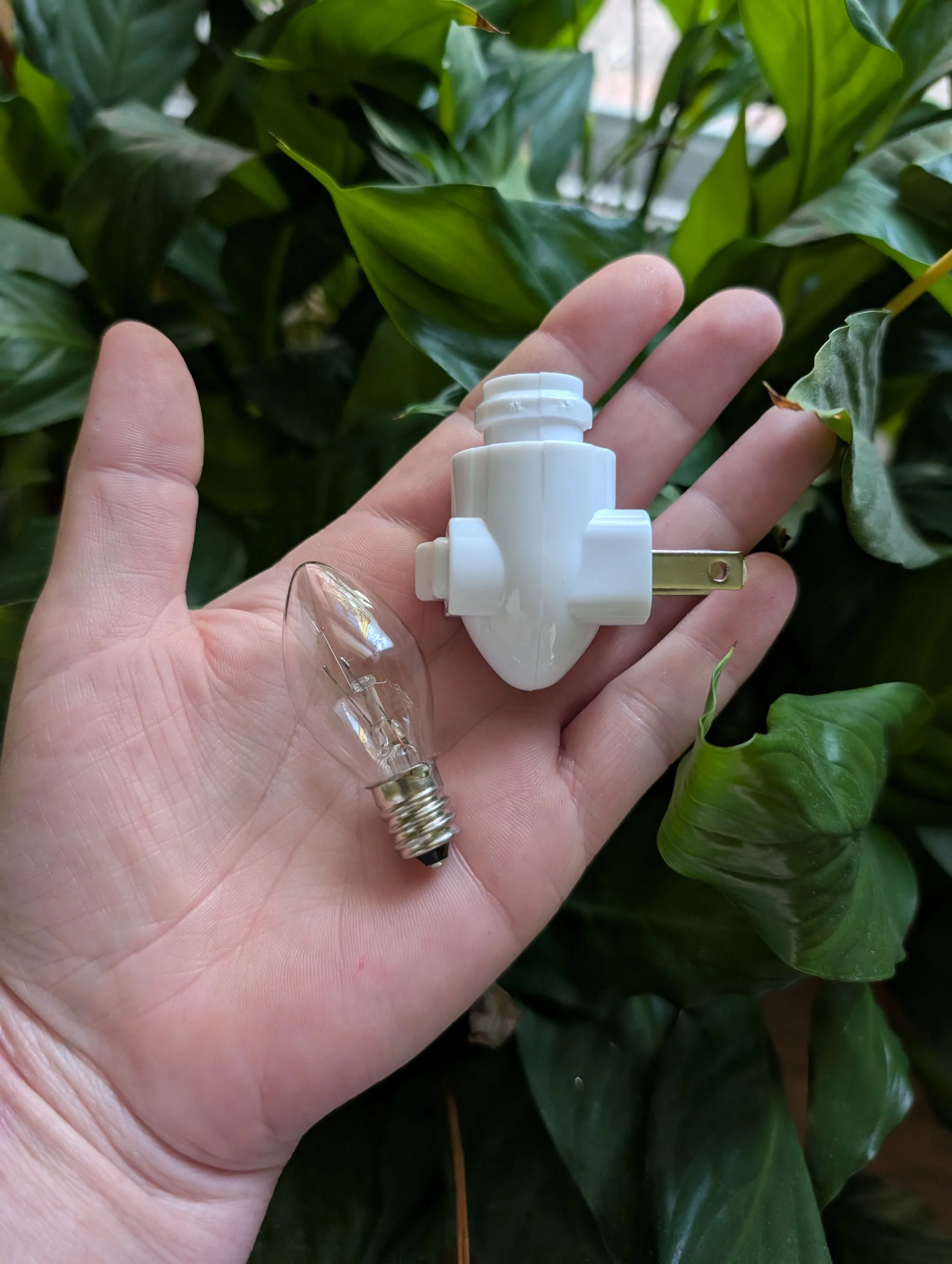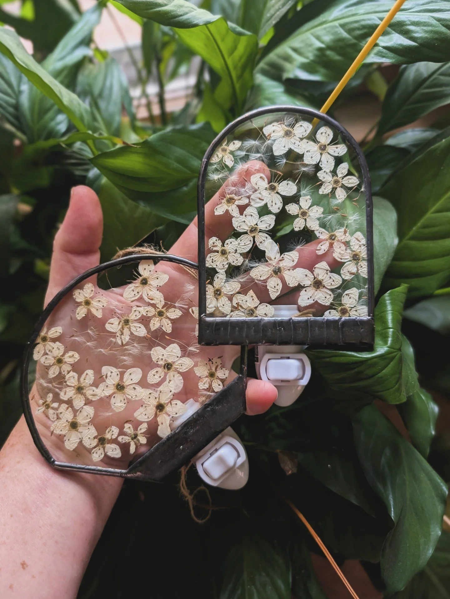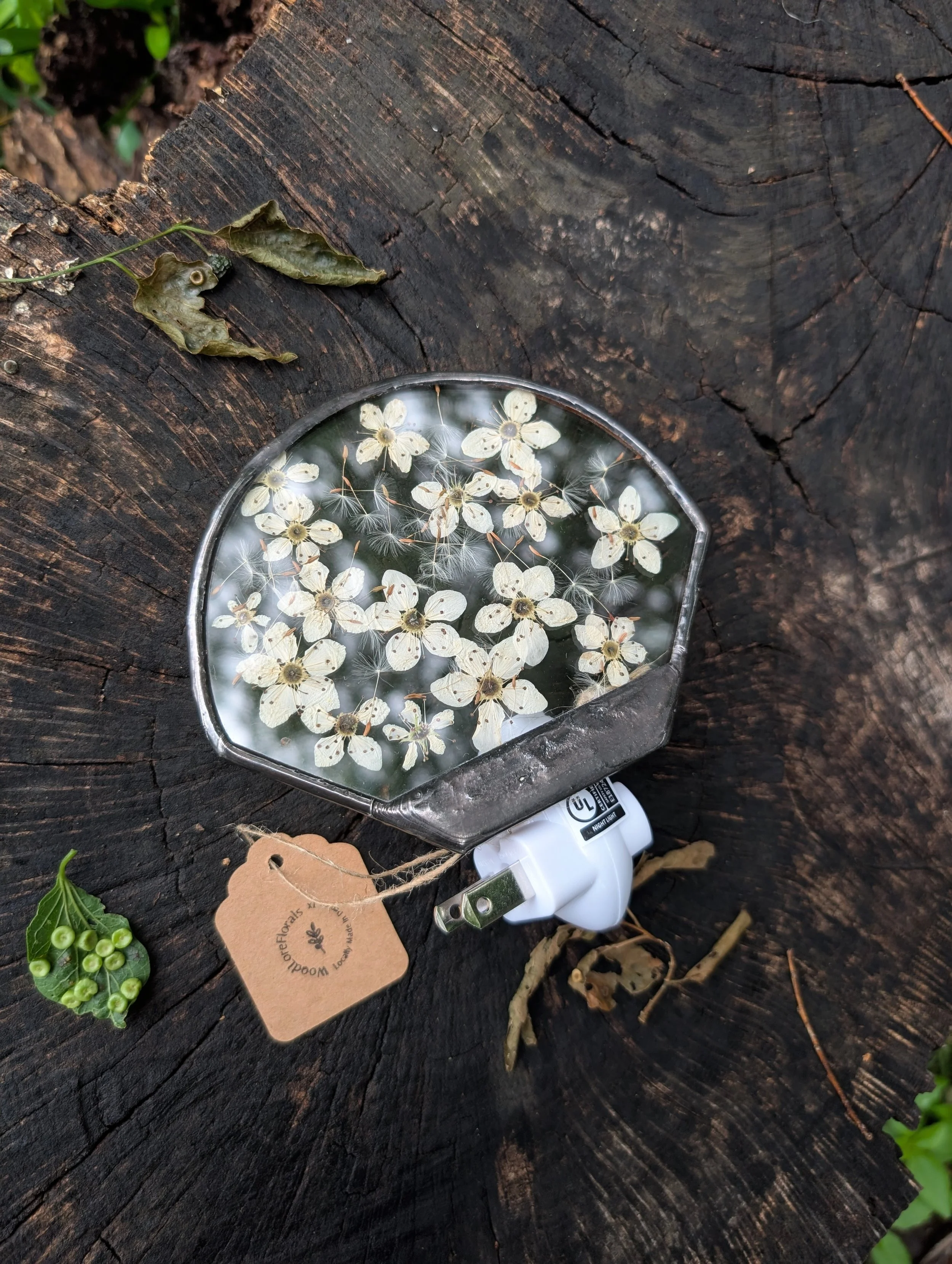 My nightlights are double paned clear glass with pressed nature inside that I’ve grown or gathered and pressed myself! They are soldered together and the edges are stained with a black patina and polished to a shine. Included with purchase is of course your nightlight hardware, as well as a bulb. I purposefully choose flowers that will either fade very slowly, or white flowers that will maintain their beauty over time.